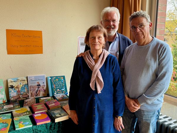 Foto: Vereinsvorstand (v.l.n.r.: Sabina Glasmacher, Axel Glasmacher, Michael Schroerlücke; Dialog-Gesundheit-Klima) am Büchertisch in Witterschlick.