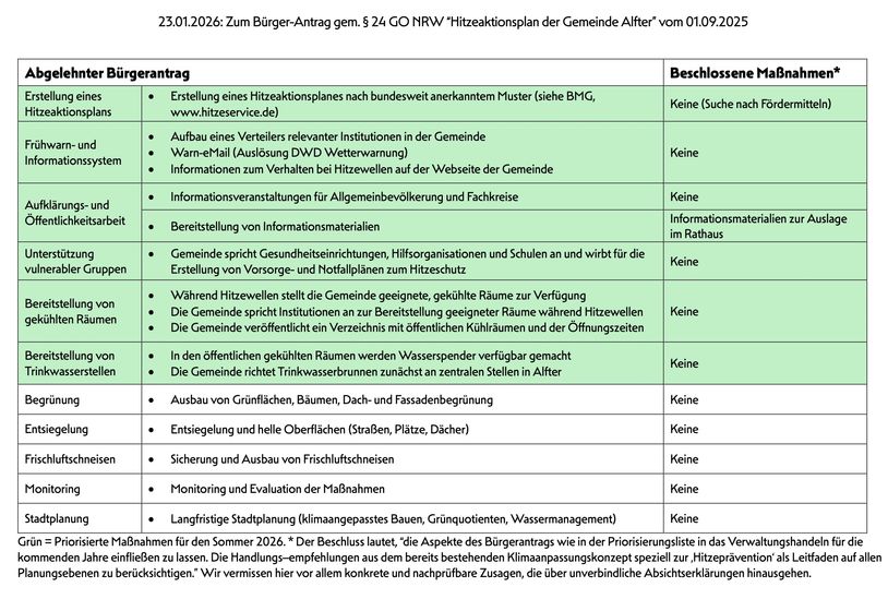 Der Umweltausschuss hat am 19.02.26 unseren Bürgerantrag für die Erstellung eines Hitzeaktionsplanes mit den Stimmen der CDU, SPD, FDP und UWG abgelehnt. Unsere Presse-Mitteilung gibt dazu umfassende Informationen. Stattdessen wurde die Vorlage der Verwaltung beschlossen, die sehr viel weniger verbindlich umsetzen will. (Vergleich s.o.). Weiterhin besagt der Beschluss “die Aspekte des Bürgerantrags wie in der Priorisierungsliste in das Verwaltungshandeln für die kommenden Jahre einfließen zu lassen. Die Handlungs–empfehlungen aus dem bereits bestehenden Klimaanpassungskonzept speziell zur ‚Hitzeprävention‘ als Leitfaden auf allen Planungsebenen zu berücksichtigen.” Wir vermissen hier vor allem konkrete und nachprüfbare Zusagen, die über unverbindliche Absichtserklärungen hinausgehen, denn entsprechende Maßnahmen aus dem Klimaanpassungskonzept, dass auch einen Hitzeaktionsplan vorsieht, sind seit Jahren nicht umgesetzt worden.