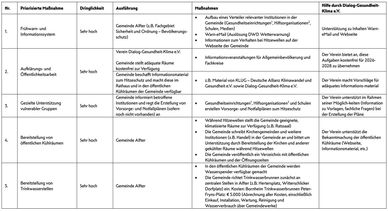 Kurzfristige Maßnahmen, die die Gemeinde schnell umsetzen kann, sind Frühwarn- und Informationssysteme, Schutzmaßnahmen für vulnerable Gruppen, Vorbereitung des Gesundheitswesens (incl. Pflegeeinrichtungen), Bereitstellung von Trinkwasserspendern und von Kühlräumen.