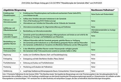 Wir haben unseren im Januar 2026 Antrag ergänzt: Eine Liste der Maßnahmen, die noch zum Sommer dieses Jahres umgesetzt werden können: Frühwarn- und Informationspläne, Aufklärung- und Öffentlichkeitsarbeit, gezielte Unterstützung vulnerabler Gruppen, Bereitstellung öffentlicher gekühlter Räume in Hitzewellen und Trinkwasserstellen. Zusätzlich bieten wir der Verwaltung unsere umfassende Unterstützung bei der Durchführung dieser Maßnahmen an.